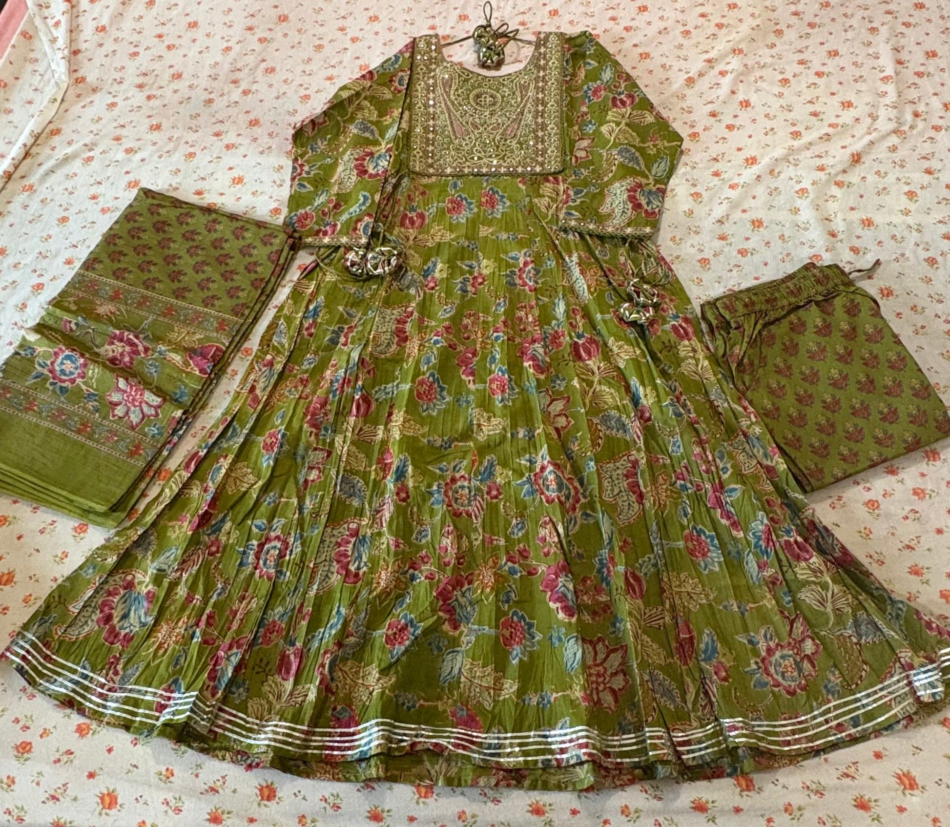 Olive Embroidered thread and mirror work Suit, Dupatta and Pant Set