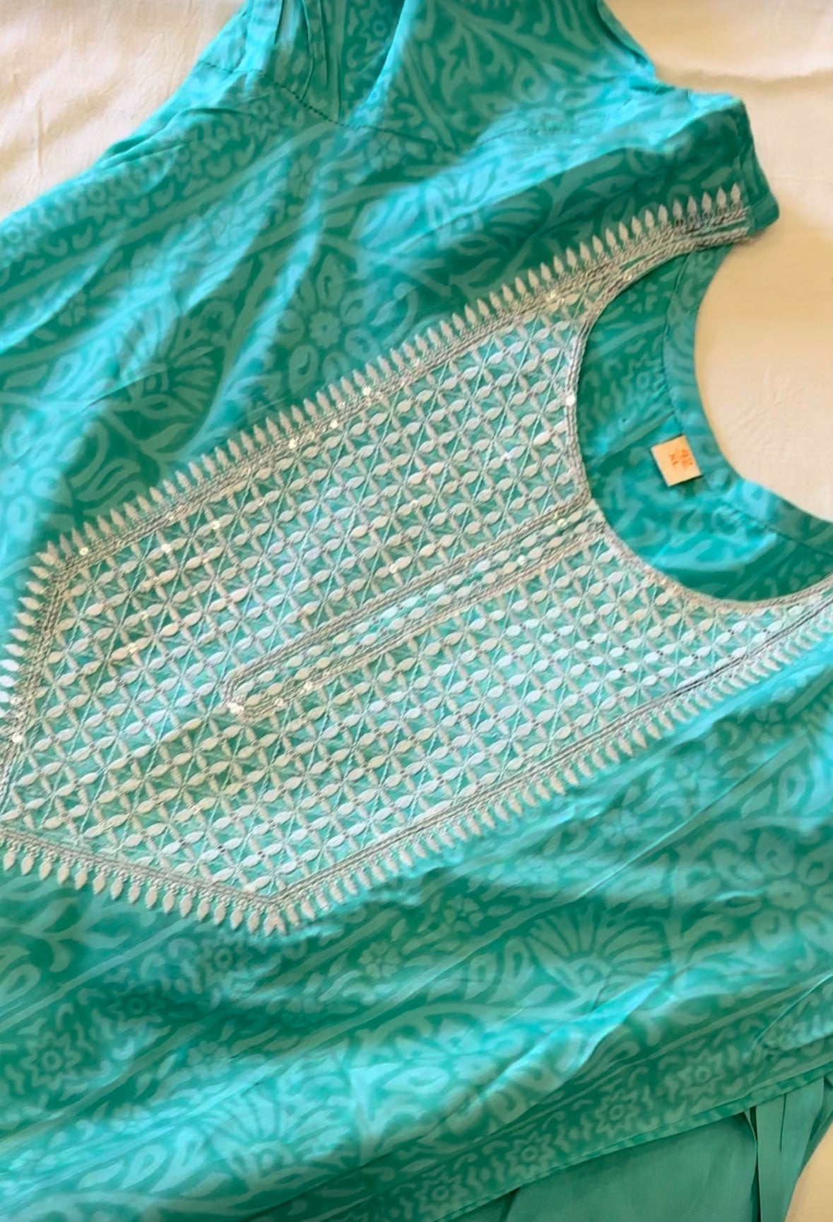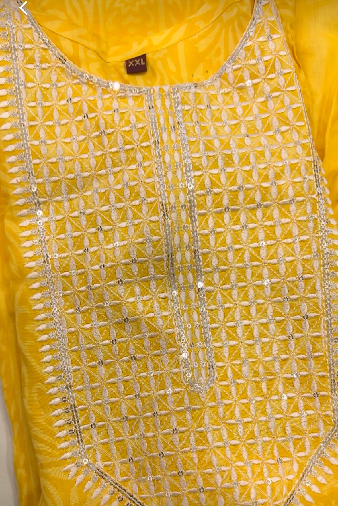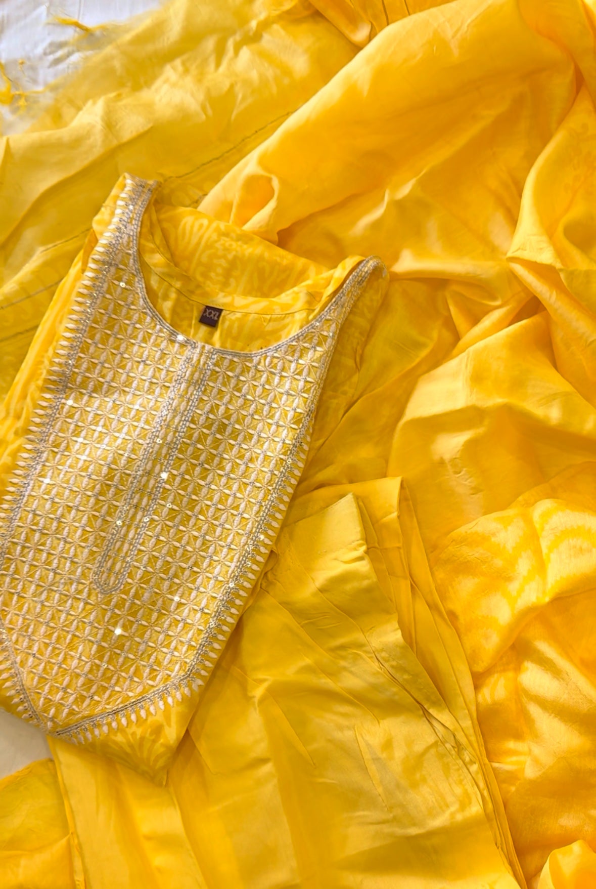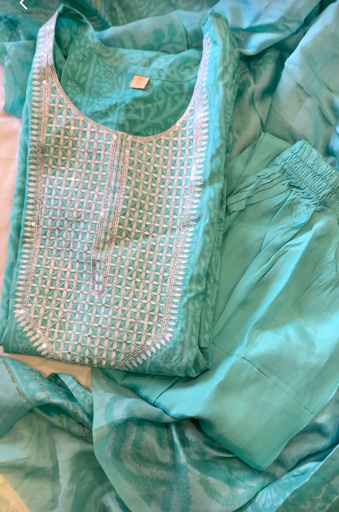 Soft Cotton Silk 3 piece suit set with heavy embroidered neckline